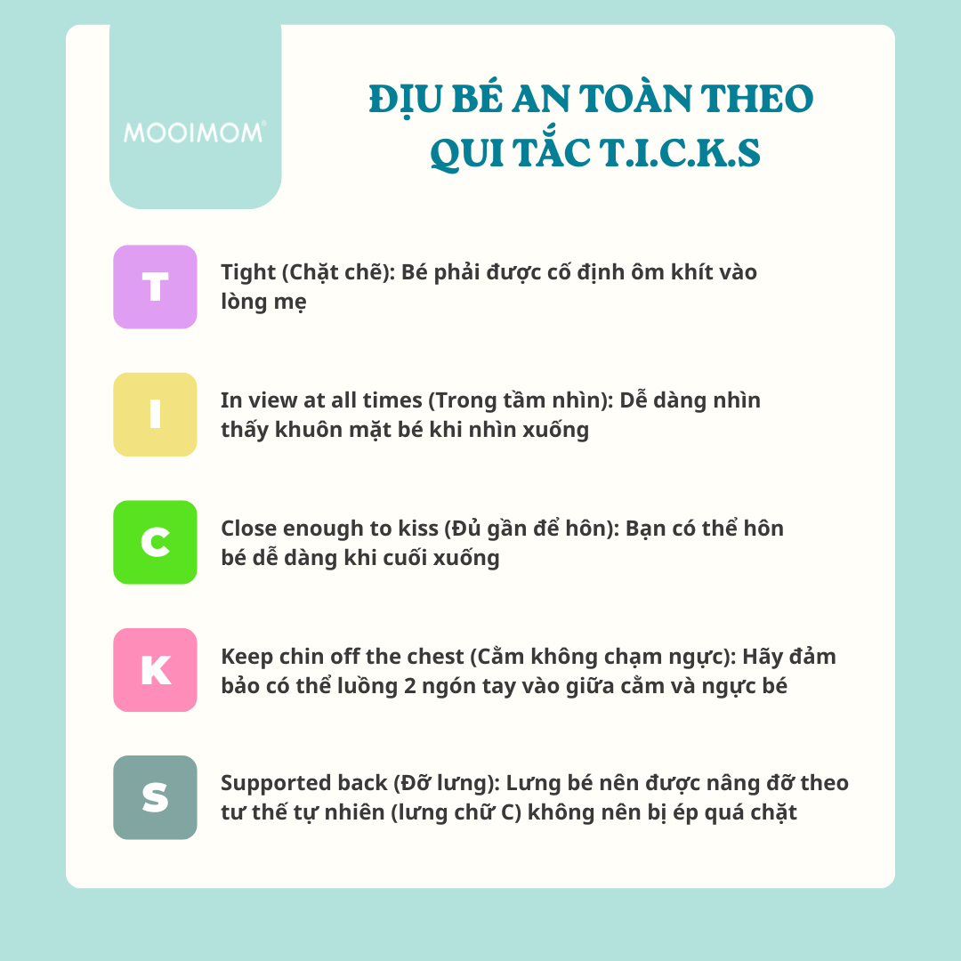 T.I.C.K.S là từ viết tắt của 5 tiêu chuẩn an toàn cốt lõi mà mọi loại địu, từ địu vải đến địu ngồi, đều phải đáp ứng.