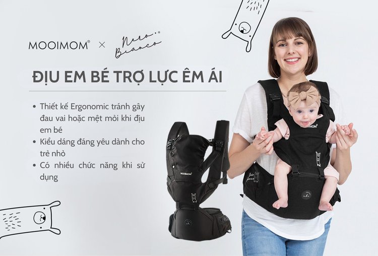 Trong những chuyến du lịch hay dã ngoại, các mẹ bỉm sẽ cần một chiếc địu tiện lợi để giữ bé mà vẫn hạn chế được việc đau thắt lưng và đau vai. Địu ngồi em bé MOOIMOM X Nero Bianco sẽ rất hữu dụng, điều chỉnh địu bé theo nhiều cách như quay mặt trước, mặt sau, và từ phía lưng bé. Thiết kế hiện đại và thời trang giúp mẹ vẫn giữ được nét sành điệu.